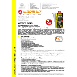 Suite aux dernières normes antipollution, les moteurs diesel sont plus sensibles à l'encrassement et incompatibles avec les petits parcours et les bas régimes. Baisse de puissance, à-coups, difficultés de démarrage à froid, hausse des consommations... sont devenus des symptômes récurrents. Ces dysfonctionnements qui congestionnent le moteur sont essentiellement dûs à un encrassement de la chambre de combustion et des segments. WARM UP® DETOX® DIESEL est un traitement curatif nouvelle génération : ses agents actifs agissent en chambre de combustion par un principe chimique afin d'éliminer les suies carbonnées, réduire les consommations, améliorer les performances et libérer le moteur de son encrassement.